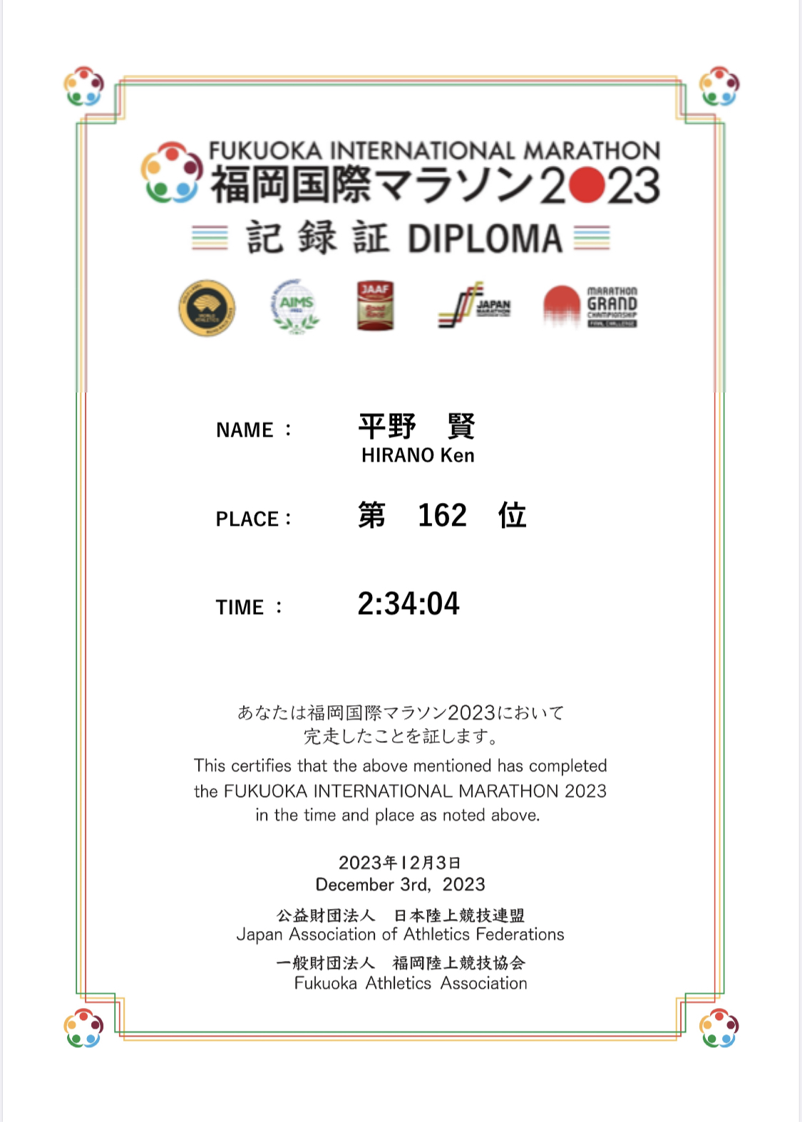 苦手だったフルマラソンを30代後半で再開して、目標としていた大会。